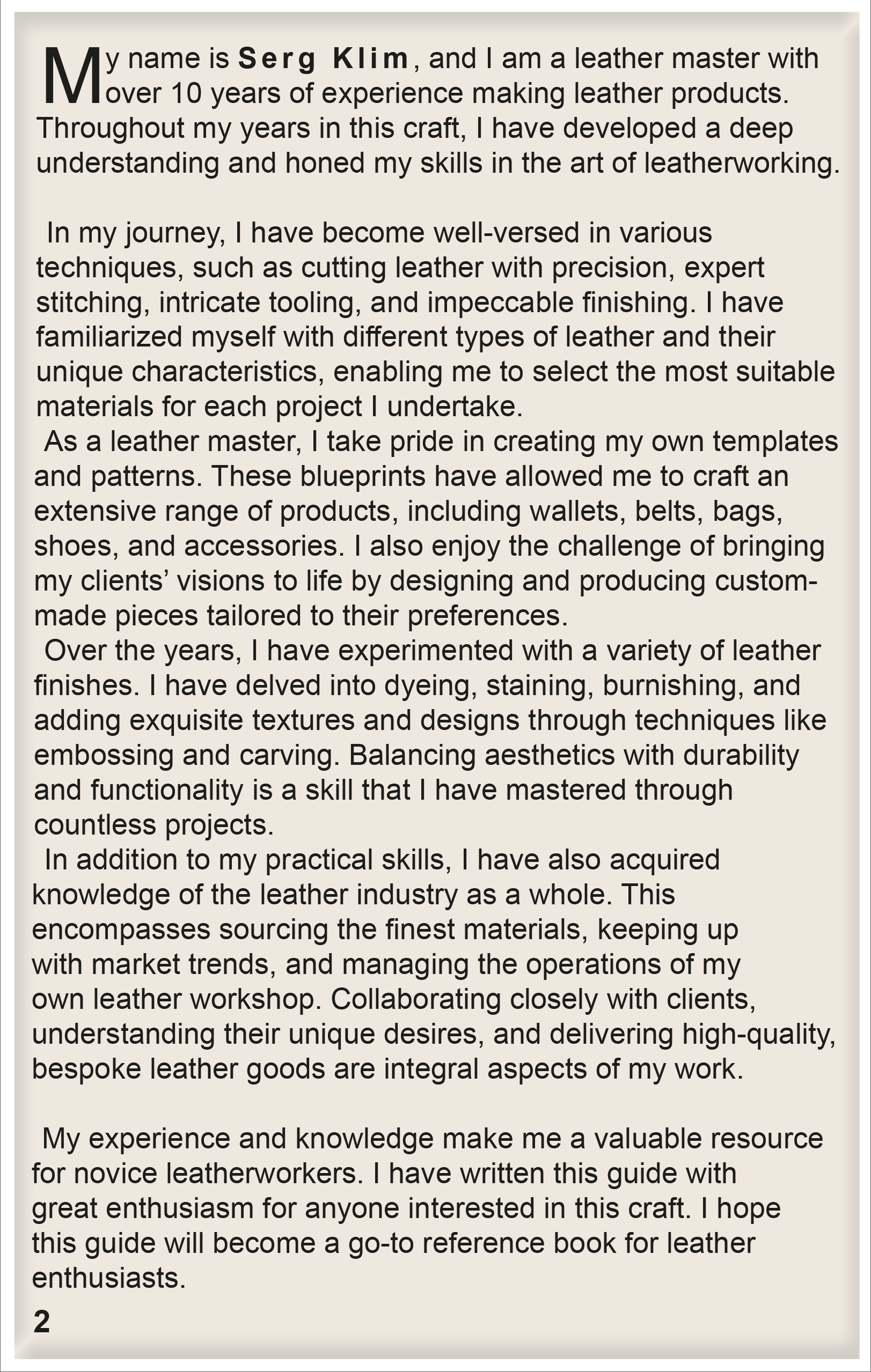 "The Leather Workshop" is a comprehensive PDF Ebook guide written by the skilled craftsman Serg Klim. This book delves into the world of genuine leather accessories, including wallets, cardholders, and belts. Whether you're a beginner or an experienced DIY enthusiast, this guide offers step-by-step instructions and valuable tips to create stunning leather art pieces. Explore the basics of leather crafting, learn essential techniques, and discover the joy of creating personalized leather goods. Unlock your creativity and elevate your craftsmanship with this ultimate leather crafting resource by Serg Klim.
