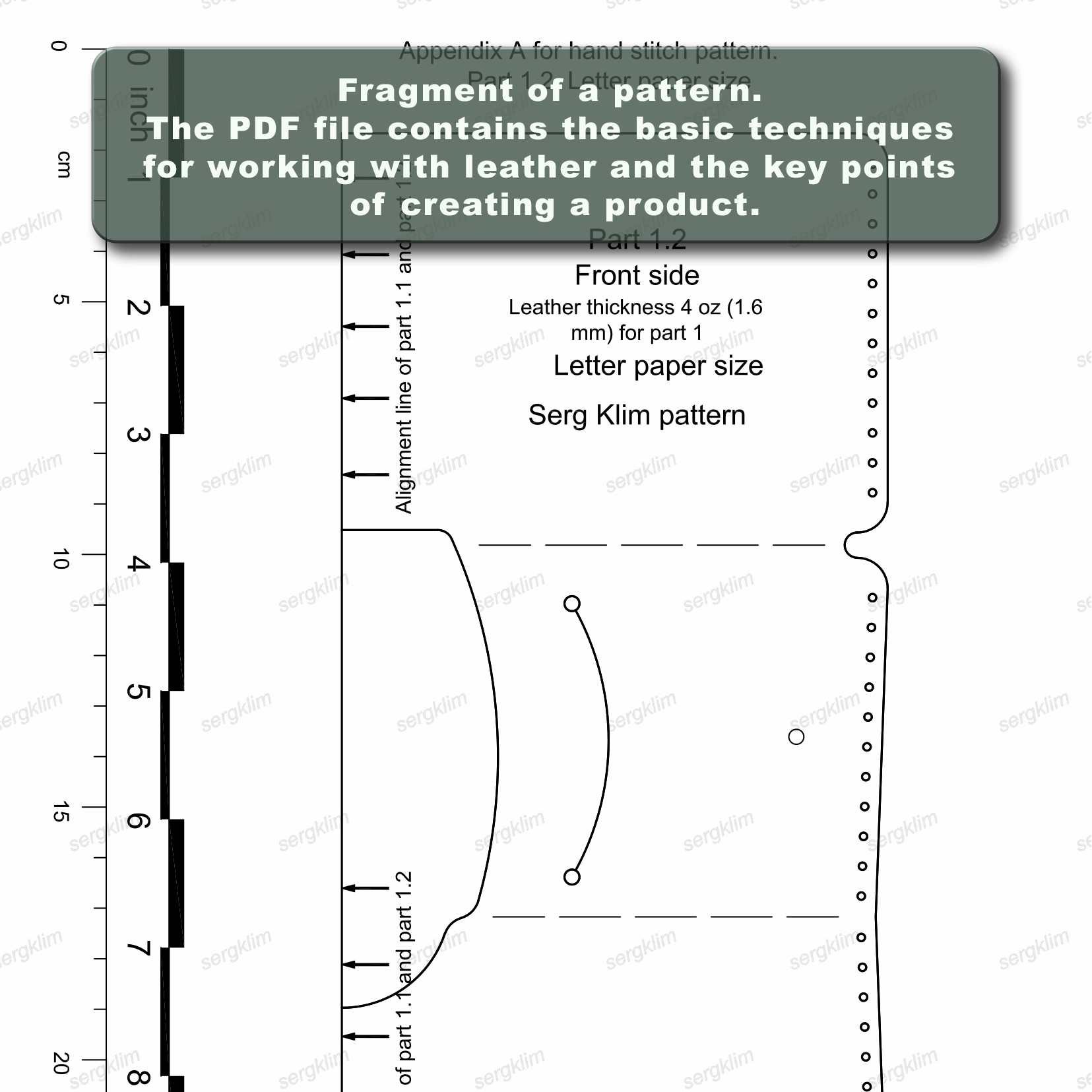 The download comes with some basic leather techniques. It also contains templates in real size of all parts of the product. This will allow you to make a finished product. The PDF pattern is for hand stitch.