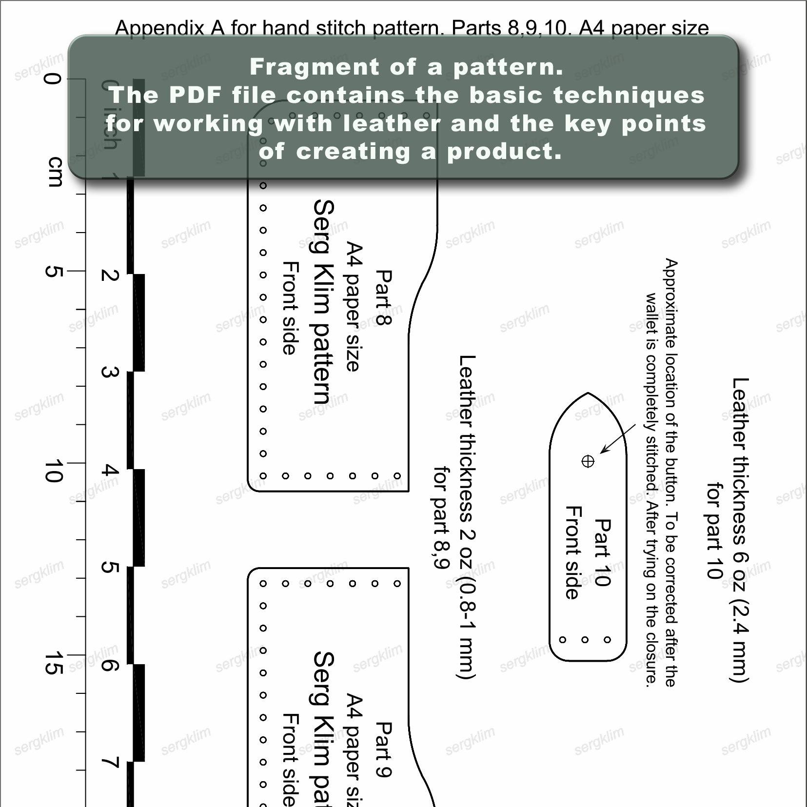 The download comes with some basic leather techniques. It also contains templates in real size of all parts of the product. This will allow you to make a finished product. The PDF pattern is for hand stitch.